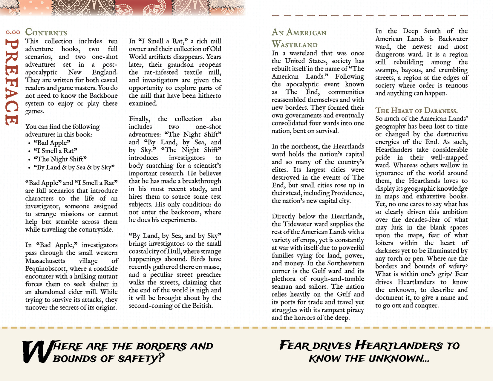 This collection includes two full scenarios, "Bad Apple" and "I Smell a Rat," along with two one-shot adventures: "The Night Shift" and "By Land & By Sea & By Sky." All stories are set in and around the American northeast, the Heartlands Ward of the Backwards Universe.