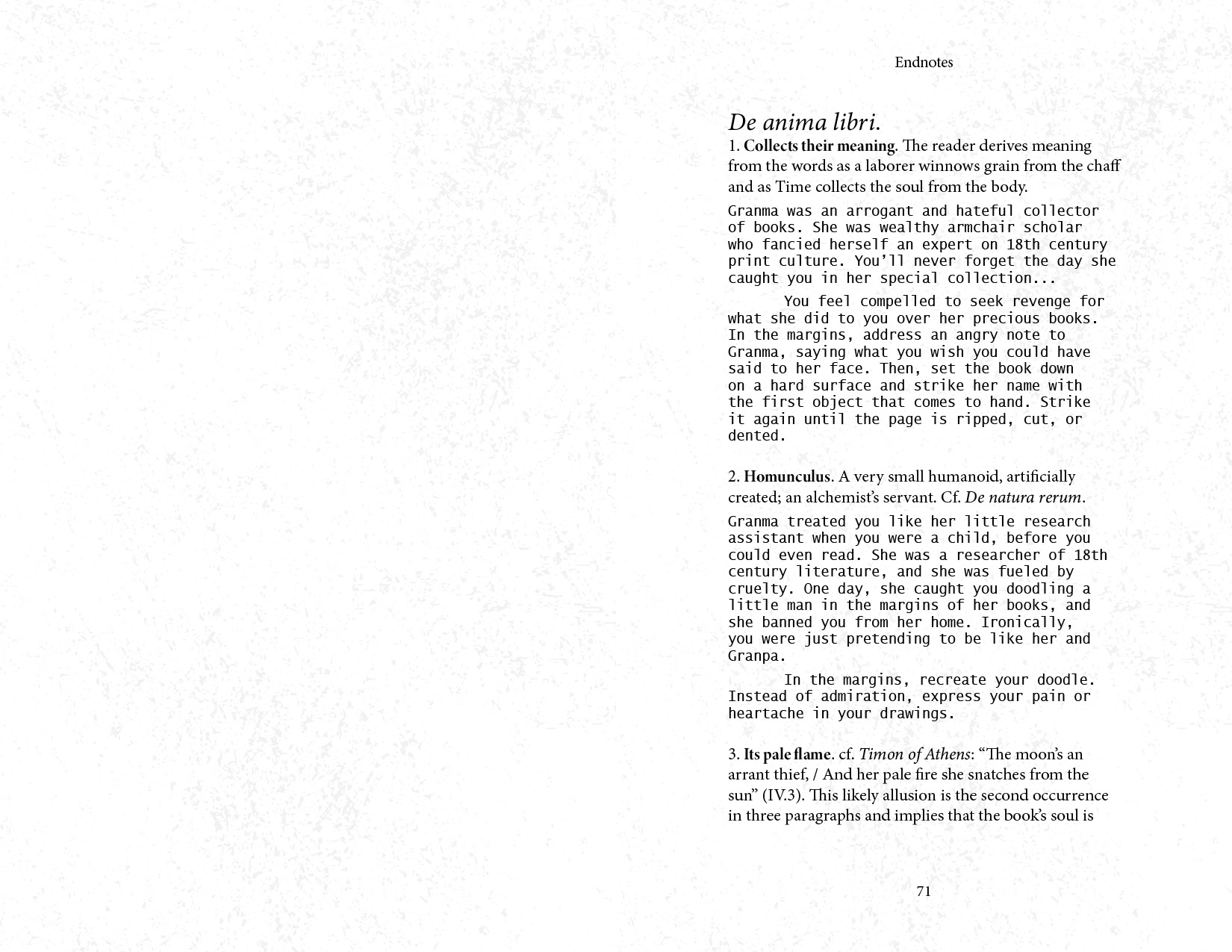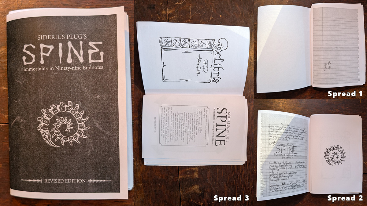 A: SPINE is replayable. Each book can be played three times. Although the broader plot remains the same, each playthrough has different experiences, and there are many secrets inside this book that you will not uncover in just one or two playthroughs. Some secrets exist outside of play, meant to be discovered only by the most astute readers. And the book’s defacement is designed in such a way that it will survive multiple playthroughs.